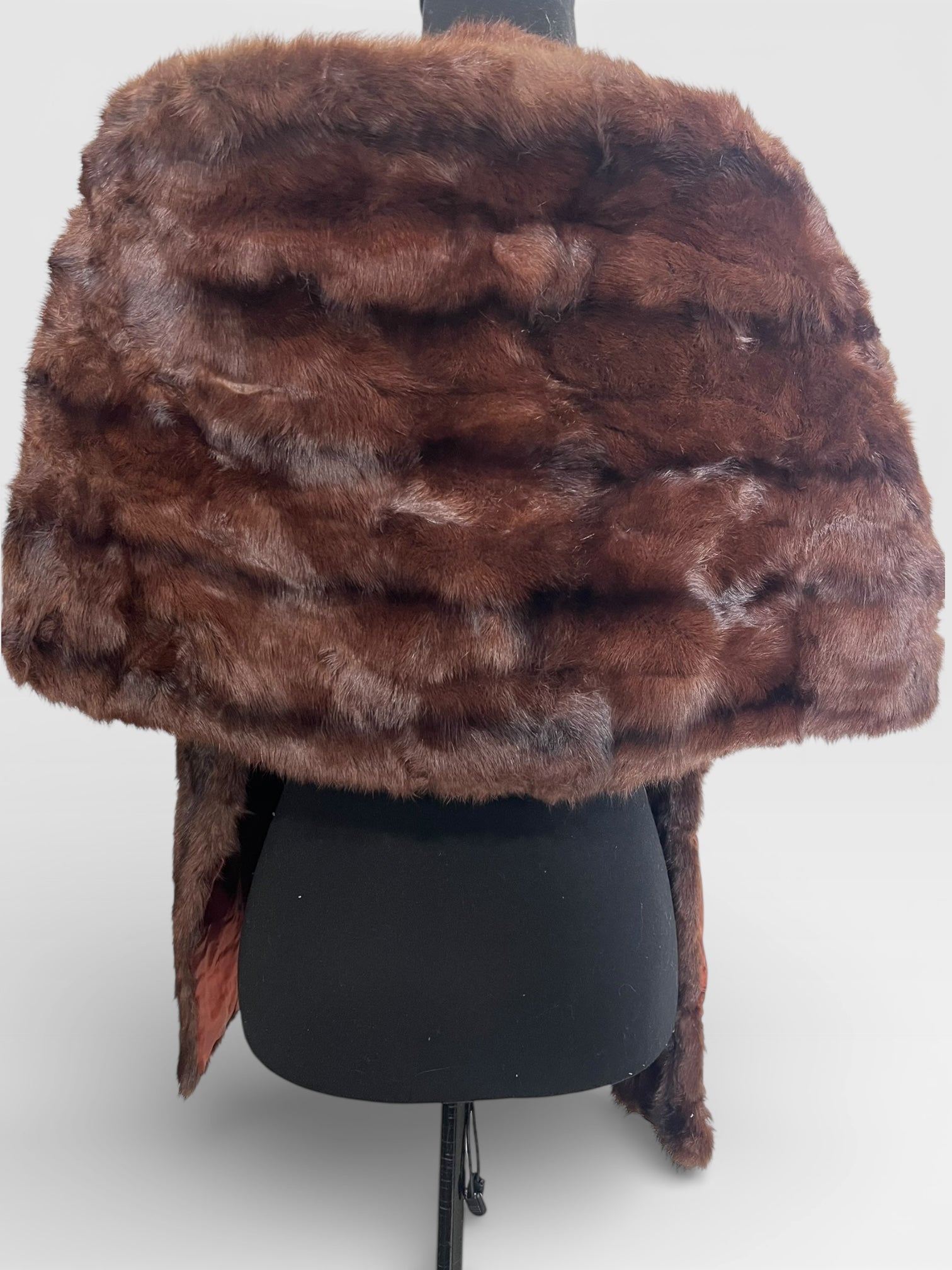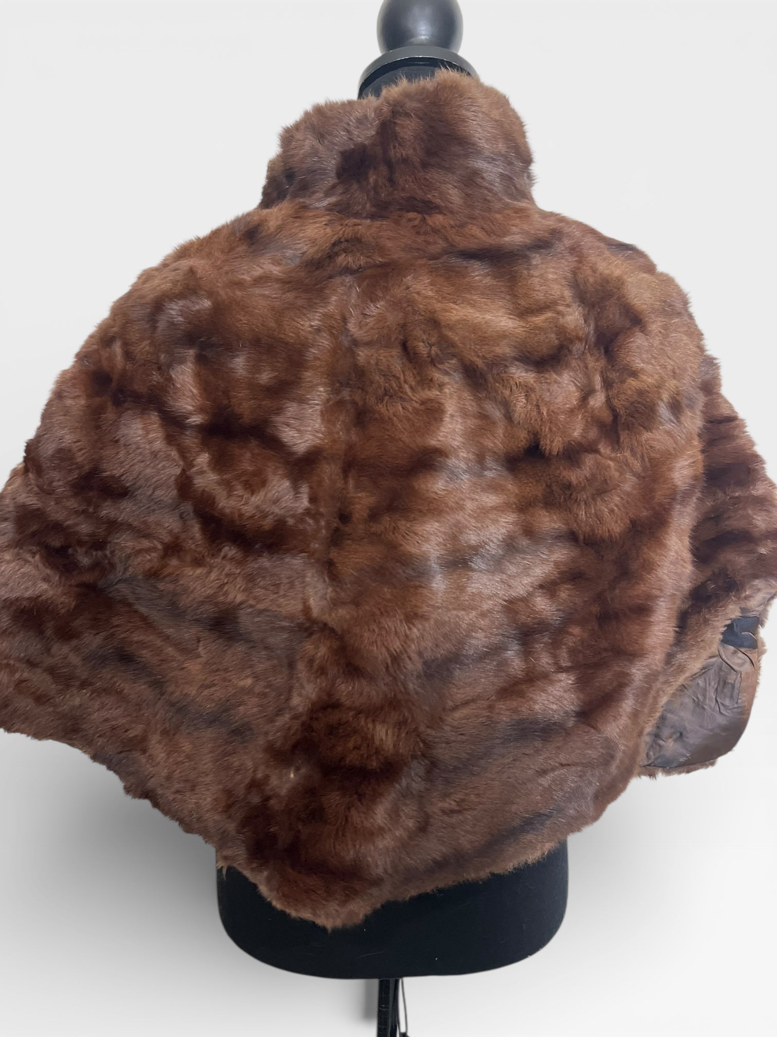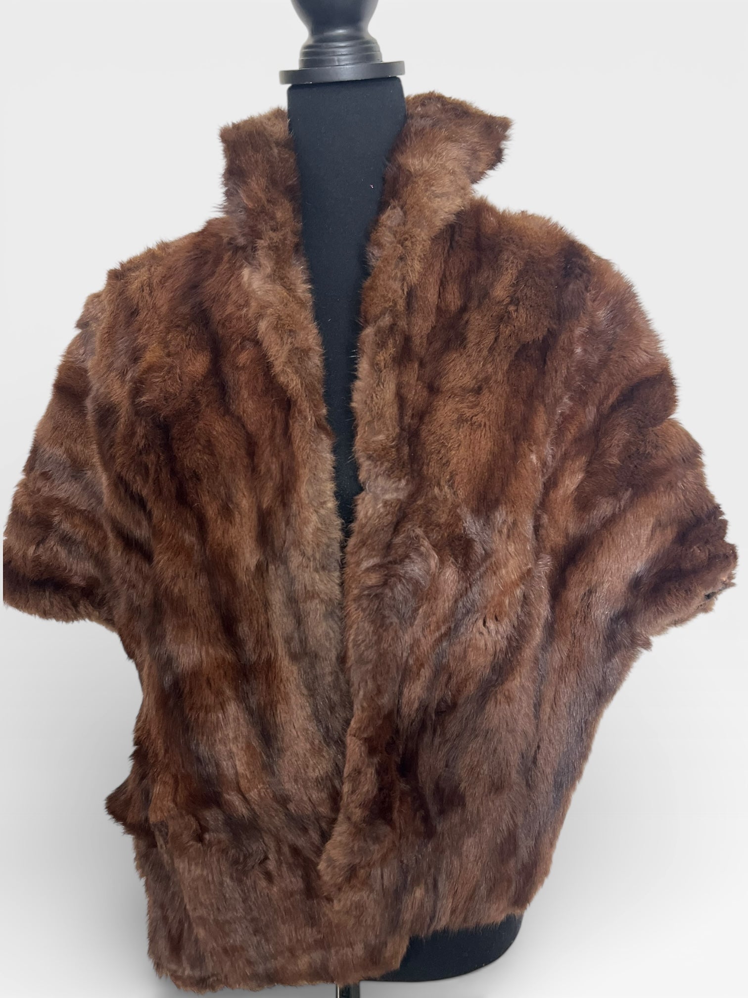 Vintage brown fur wrap with soft shawl-style drape. Relaxed silhouette with fuller coverage across shoulders and upper arms. Ideal statement layer for cold-weather styling.