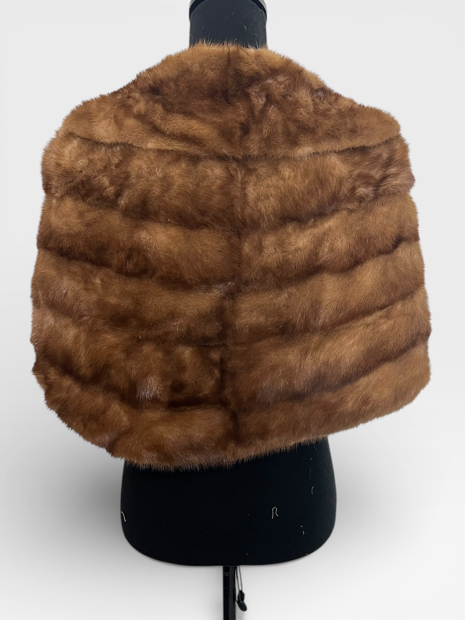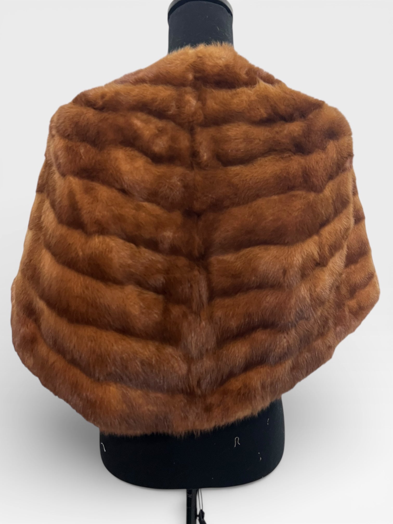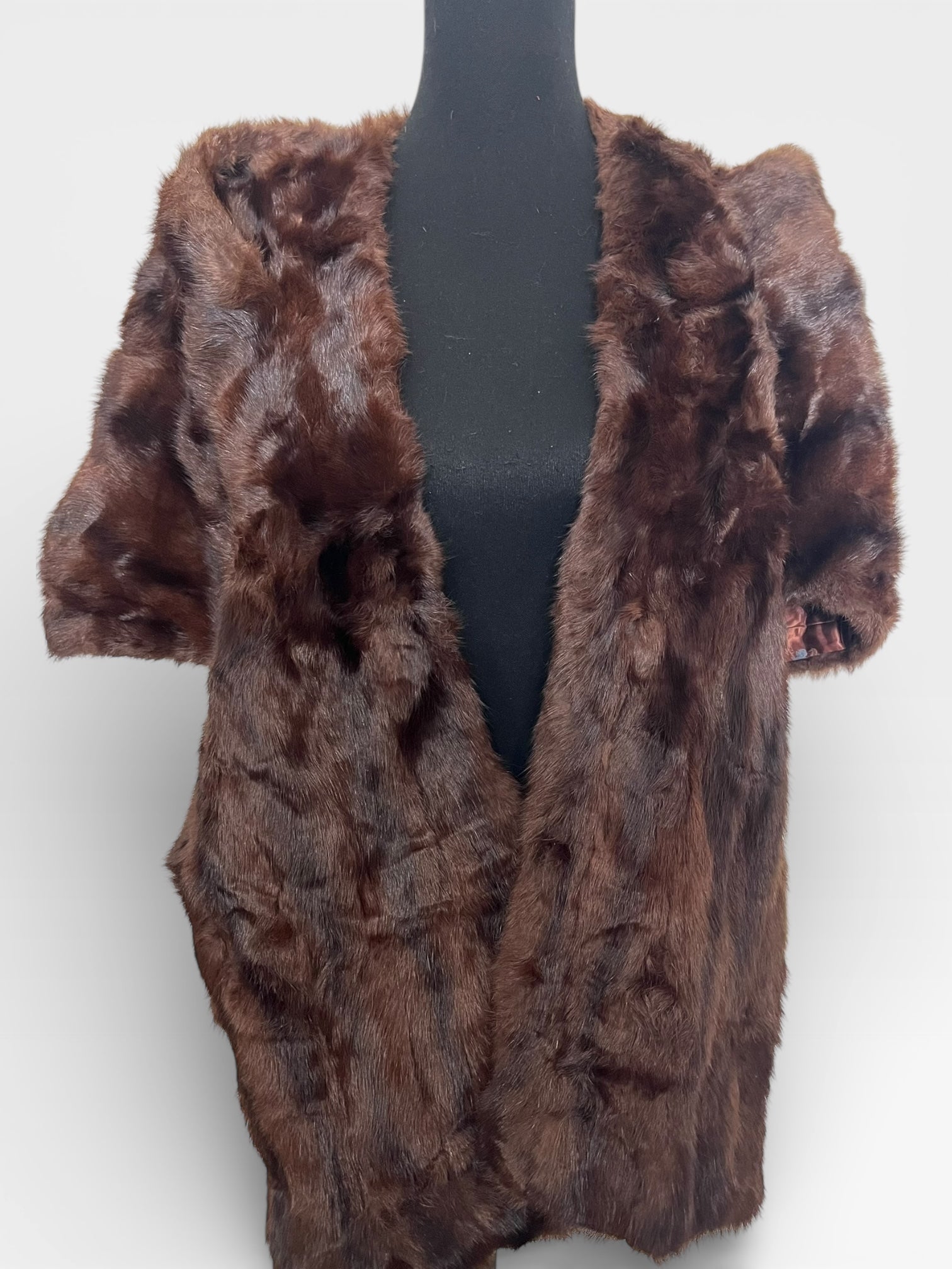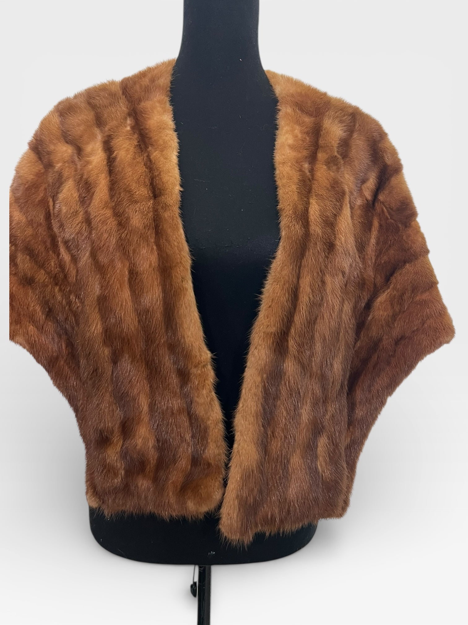 Vintage short-sleeve fur stole in a rich golden-brown hue. Lightweight feel with a smooth, even fur finish. Classic and versatile—easy throw-on for elevated looks.